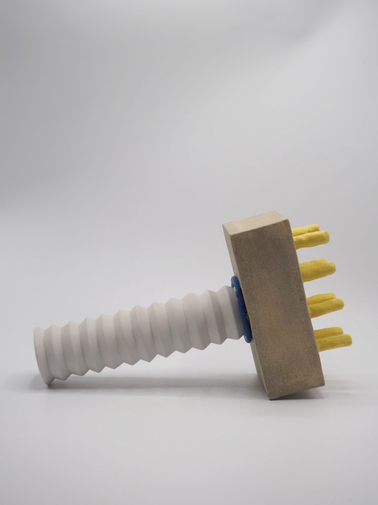 C’est l’enfance qui inspire Quentin Marais dans ses sculptures colorés, à la frontière du figuratif et de l’abstrait. Découpages, collages, assemblages, coloriages et barbouillages : toutes ces notions nourrissent et construisent ses réalisations. L’argile lui offre cette liberté. Elle est pour lui le pont entre un monde symbolique et notre univers contemporain. Elle offre la plasticité entre l’utile et l’inutile et révèle le lien entre l’imaginaire et le concret. « Il n’y a pas de nostalgie ou de mélancolie, mais une envie de trouver cette liberté « primaire » et cette légèreté enfantine ». Comme un jeu de construction, comme un jeu de mémoire.Les pièces de Quentin sont réalisées par des assemblages de grès et de porcelaine. Elles sont façonnées au colombin, à la plaque, en estampage ou modelage. La terre est parfois laissée brute, décorée, émaillée ou teintée dans la masse.